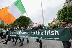 The main plank of the National Party programme is its opposition to immigration. It has stated that the housing crisis can be solved by "the deportation of people seeking asylum."[99] It has campaigned on the slogan "House the Irish, Not the World".[98] In 2025, the party endorsed the far-right policy of 'remigration'. Its members marched with a banner reading "Aisimirce Anois! Remigration Now" in April 2025.[100]