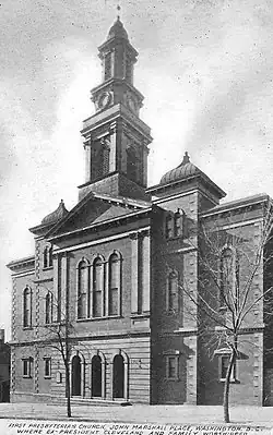 Sunderland served as Chaplain of the United States Senate during the Civil War and again in the 1870s and was a friend and adviser to President Abraham Lincoln.[16] Among the pastor's many contributions to the Presbyterian denomination and the Washington area was his role as a founder of what is today Gallaudet University. Presidents John Quincy Adams, Andrew Jackson, James K. Polk, Franklin Pierce, James Buchanan, Ulysses S. Grant, Grover Cleveland, and Benjamin Harrison worshiped at “Old First.”[17][18] Sunderland performed the marriage ceremony of President Grover Cleveland and Frances Folsom at the White House.[19] Orators of the day who spoke from the church's pulpit included Daniel Webster, Henry Clay, Henry Ward Beecher, and T. DeWitt Talmage, who later became pastor of First Presbyterian Church and then editor of the Christian Herald magazine.[20]