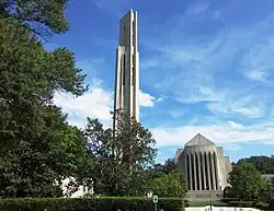 The Tower of Faith is a 178 feet (54 m) structure that provides a landmark for the site. It contains a bell carillon consisting of 61 Flemish bell-tone generators in bronze struck by hammers, manufactured by the Schulmerich Carillon Company. In addition, there are 25 English bells, relocated from the tower of the Church of the Covenant. Both sets are playable from either organ console in the main sanctuary or the chapel.[14]