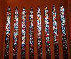 The sanctuary is illuminated by 73 faceted stained glass windows designed by Willet Studios of Philadelphia. The windows comprise one of the largest collections of faceted glass in the United States. Described in detail in a book published in 2012,[13] the windows range from the shorter windows lining the chancel sides that depict Bible stories to the two larger transept windows, each made of eight 31-foot (9.4 m) tall lancets. The north transept window contains abstract designs drawn from images in the book of Revelation. The text at the top reads "I know that my Redeemer liveth and at last will stand upon the earth" (Job 19:25).