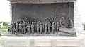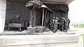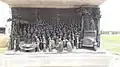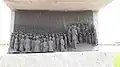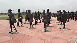 To the left of the main memorial there is a life sized statue of Gandhi with 78 volunteers. These statues are made of bronze.[1] An Open Call for sculptors was made and 40 sculptors were selected from India, Austria, Bulgaria, Burma, Japan, Sri Lanka, Tibet, UK and United States. Each sculptor created two sculptures each. After the clay sculptures had been completed, molds and fiber casts were made and the sculptures were cast in silicon-bronze alloy by Studio Sukriti in Jaipur.[7]