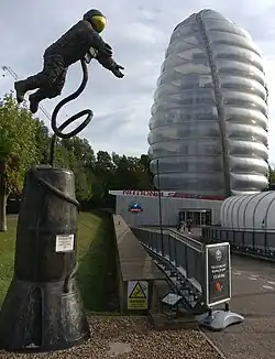 The 7,360m2 scheme occupies a former storm water tank,[24] which now forms the foundations of the building, reducing costs and maximising the reuse of the existing structure.[25] The main rocket tower is clad in inflated pillows made of ETFE – the same material used on the Eden Project domes.[26] This material is 1% of the weight of the equivalent amount of glass.[27] The building was described by The Guardian as "One of the most distinctive and intriguing new buildings in Britain".[28] The main building is a 7200m2 box built on a 14m grid steel frame, clad in a perforated metal skin that conceals the windows and louvres in the profiled steel cladding behind.[29] The roof of the main building is overlaid with gravel in three colours to form a crab nebulae design.[30]