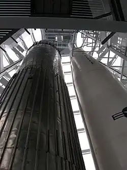 Nicholas Grimshaw, the architects of the Eden Project, won an architectural competition to design the National Space Centre in September 1996 beating four other architects.[3] The fit out of the building was undertaken by C-Beck Group.[21] The structural and services engineer was Arup, the quantity surveyor was Capita Property Services, the project manager was Gardiner and Theobold, management services and main contractor was Sir Robert McAlpine, the landscape architect was Land Use Consultants, the cladding consultant was Montressor Partnership, and the acoustic consultant was Sandy Brown Associates.[22] The tower is 42 m (138 ft) tall and claims to be the only place to house upright space rockets indoors.[23]