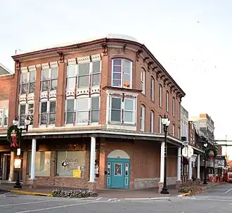 National State Bank is a historic building located in Mount Pleasant, Iowa, United States. Because this two story, brick Italianate structure was built specifically as a bank, it features a chamfered corner, which was commonly used to designate a bank in the last quarter of the 19th century.[2] However, it combines other features typical of an Italianate commercial building in an unusual way. The secondary facade has segmental arched windows that are regularly spaced, while the primary facade has the windows in a sophisticated arrangement that one would expect of an architect-designed building. (The potential architect of this building, or even its builder, are unknown.[2]) The metal cornice has widely spaced brackets on the primary facade and more typically spaced on the secondary facade. It also lacks an identification pediment on the corner, which is typical of the style.[2] The building was listed on the National Register of Historic Places in 1991.[1]