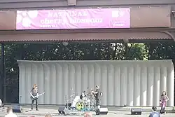 The National Sylvan Theater — often simply the Sylvan Theater — is a public sylvan theater on the grounds of the Washington Monument, National Mall, in Washington, D.C., USA. It is located within the northwest corner of the 15th Street and Independence Avenue intersection,[1][2] about 450 feet (137 m) southeast of the Washington Monument. A wooden stage is set in a graded depression surrounded by a grove of trees. It appears as a natural amphitheater integral to the historic greensward of the monument grounds. A gathering of 10,000 event attendees may stretch from the theater stage back to the monument's base.[3] The Sylvan Theater was the first federally funded theater in the United States.[4]