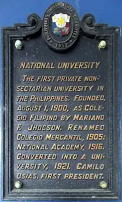 National University (Filipino: Pamantasang Pambansa) commonly known as NU, colloquially National U, is a private non–sectarian university located in Sampaloc, Manila, Philippines. The founder of the university, Mariano F. Jhocson Sr., established the institution on August 1, 1900, as Colegio Filipino in Quiapo, Manila. It is considered as the first private nonsectarian and coeducational institution in the Philippines and also, the first university to use English as its medium of instruction, replacing Spanish.[1]