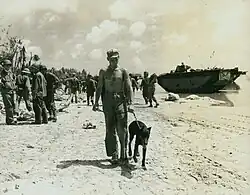 The island of Guam, an American territory since 1898, was captured by Japanese forces on December 10, 1941, in the first days of the U.S. entry into World War II. Guam was held by the Japanese for two and a half years, until U.S. Marines landed to retake the island in July 1944. Along with them were the 2nd and 3rd War Dog Platoons, used as sentries and scouts in over 450 patrols.[1][2] They explored the island's cave system, detected land mines and booby traps, and guarded sleeping Marines.
