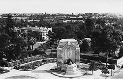 Little progress had been made on the memorial by 1926. Although some debate occurred about the form the memorial would take,[22] the focus of discussions was on the location of the memorial, the future of Government House and the role of the Governor. Several left-wing politicians argued that the grounds of Government House should be turned over to the State and used to build the memorial; conservatives desired to retain the status quo.[6] By 1925 the committee was prepared to accept the Government House grounds as the site of the memorial, but delayed making an announcement.[23] This proved to be fortuitous since legal issues prevented the plan from going ahead. Instead, a portion of the grounds, located at the corner of North Terrace and Kintore Avenue, was put aside for the purpose.[6][note 2]