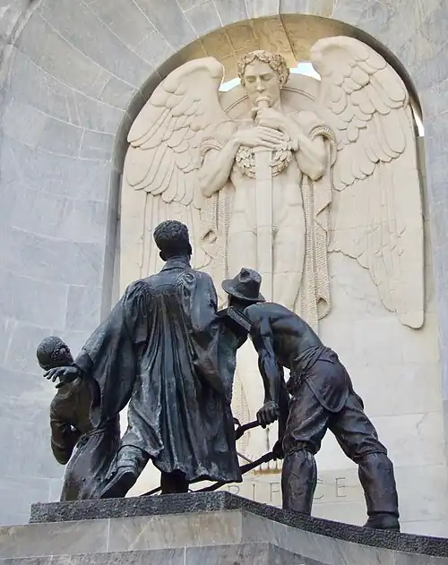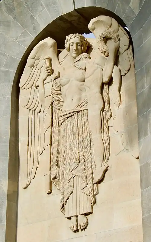 To represent the prologue to the war, the obverse of the monument (the side facing North Terrace) features a relief of the Spirit of Duty appearing as a vision before the youth of South Australia, represented in the work by a sculptural group consisting of a young woman, a student and a farmer abandoning the "symbols of their craft".[48] The three are depicted in normal dress, as they are not yet soldiers and are currently unprepared for the war that is to come,[49] and they are facing away from the world as they look to the vision before them.[50] In Bagot's original plan, submitted for the 1924 competition, there was to be but a single nude figure kneeling before the vision (for which Bagot posed while in Europe), but Laybourne Smith's 1926 submission became grander in its scope.[6] In addition, Bagot's original designs were naturalistic, with the Spirit of Duty depicted as a female figure, but under Hoff's direction the figure was changed to male, and the style of the reliefs was changed to Art Deco – a "radically new" art style for Australia at the time.[51] Hoff, however, presented the sculptural group in the original naturalistic style, thus providing a "bridge between the Renaissance-style architecture and the Art Deco of the reliefs".[32]