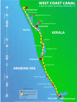 The West Coast Canal or National Waterway No 3 is a 205 km (127 mi) long inland navigational route located in Kerala, India, which runs from Kollam to Kottapuram. It was declared a National Waterway in 1993. In addition to the main stretch, Champakara and Udyogmandal canals are navigable and connect the industrial centers of Kochi to Kochi port Inland Waterways Authority of India (IWAI) under the Ministry of Shipping is coordinating the task for developing, monitoring and administering national waterways. It is the first National Waterway in the country with 24-hour navigation facilities along the entire stretch. It has been extended to Kozhikode by the National Waterways Act, 2016.[1] The National Waterway 3 mainly passes through the previous Thiruvananthapuram–Shoranur canal.