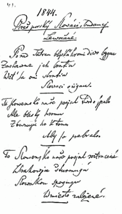 No authorized version of Matúška's lyrics has been preserved and its early records remained without attribution.[5] He stopped publishing after 1849 and later became clerk of the district court.[6] The song became popular during the Slovak Volunteer campaigns of 1848 and 1849.[7] Its text was copied and recopied in hand before it appeared in print in 1851 (unattributed, as Dobrovoľnícka – Volunteer Song),[8] which gave rise to some variation, namely concerning the phrase zastavme ich ("let's stop them")[9] or zastavme sa ("let's stop").[10] A review of the extant copies and related literature inferred that Matúška's original was most likely to have contained "let's stop them." Among other documents, it occurred both in its oldest preserved handwritten record from 1844 and in its first printed version from 1851.[11] The legislated Slovak national anthem uses this version, the other phrase was used from 1920 to 1993 (as the second part of the anthem of Czechoslovakia with Kde domov můj).
