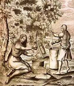 Life in society varies from tribe to tribe and region to region, but some general perspectives of women include that they "value being mothers and rearing healthy families; spiritually, they are considered to be extensions of the Spirit Mother and continuators of their people; socially, they serve as transmitters of cultural knowledge and caretakers of children and relatives."[5] Many Native American tribes believed that they originated from a woman, with many of their legends and creation stories depict a "mother earth."[6] Women were entrusted with overseeing a tribe's agricultural systems, and were responsible for harvesting and cultivating the vegetables and plants for their people. Tribal women like the Algonquians planted their fields meticulously and in a way that kept the land sustainable for future use. After harvesting a tract of land until the soil lacked nutrients to continue, women would be tasked with deciding when and where to clear new fields, allowing the used ones to regenerate.[7] Women in the Haudenosaunee tribes often controlled the distribution of food among their people.[8] Their perceived position as beings of spiritual power gave women in some tribes the opportunity to be healers for minor injuries, as men were more commonly shamans, chiefs, and herbalists.[8]