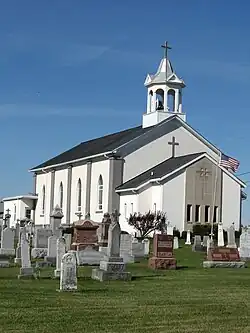 Two former parish schools lie along Cassella-Montezuma Road, immediately south of the church. These one-room schools share several architectural features, including double round windows and double doors on their facades.[3] Many parishes in the region built schools for their children; while many one-room schools have been demolished or greatly changed, others have been converted into parish halls or other non-scholastic types of buildings.[8]: 4