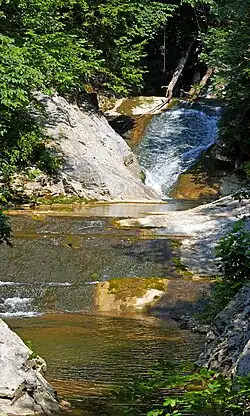 Natural Bridge is a geological formation in Rockbridge County, Virginia, United States, comprising a 215-foot-high (66 m) natural arch with a span of 90 feet (27 m). It is situated within a gorge carved from the surrounding mountainous limestone terrain by Cedar Creek, a small tributary of the James River. Consisting of horizontal limestone strata, Natural Bridge is the remains of the roof of a cave or tunnel through which the Cedar Creek once flowed.