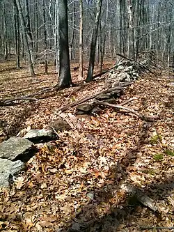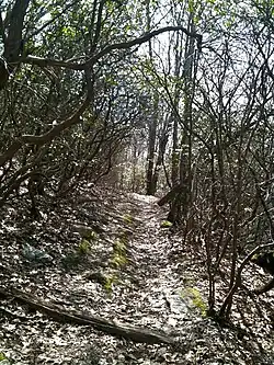 The Naugatuck Trail is a 6.8-mile (10.9 km) Blue-Blazed hiking trail "system" in the eastern central-lower Naugatuck River Valley in New Haven County, Connecticut, USA. It is almost entirely contained in the Naugatuck State Forest.[1] The mainline (officially the "Blue" or "non-dot") trail is primarily east to west with three short side or spur trails. Composed of four trails (including the primarily East-to-West mainline trail (5.5 miles) plus three shorter side trails), at its western end the trail ends with a section alongside Route 8 and the Naugatuck River. During the 1930s and 1940s, it was much larger. But post–World War II housing developments of the Connecticut Blue-Blazed Trails, led to its drastic reduction.