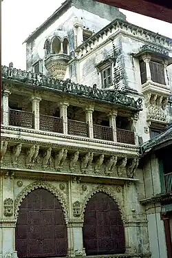 The Naulakha Palace, the oldest extant palace in Gondal, India, dating back to the 18th century (1748) during the reign of Haloji Sagramji, with a "sculpted facade"[1] is a part of the Darbargardh fort complex. It is named "Navalakaha" meaning rupees "nine lakhs" (Rs 900,000) which was the cost of building it at that time.[2] It has stone carvings with "jharokhas" (balconies), a pillared courtyard, delicately carved arches, and a unique spiral staircase. The large chandelier-lit "durbar" hall (court house) witnesses stuffed panthers, gilt wooden furniture, and antique mirrors.[1][3][4][2] The "private palace museum" displays an array of silver caskets which were in the services of carrying messages and gifts for the Maharajah Bhagwat Sinhji on his silver jubilee as ruler of Gondal.[4] The palace is situated in Gondal city, which is well connected by road, rail and air services. It is located 38 kilometres (24 mi) away from Rajkot,[1] which is also the airport (40 kilometres (25 mi) away) and rail head.[4]