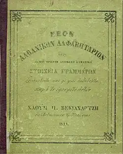 In 1824 or 1825[9] he started the creation of his alphabet of the Albanian language.[13] The final version of his thirty-three-letter Vithkuqi alphabet, whose characters were invented by Veqilharxhi, was printed as part of primer in 1844-5 titled Ëvetari Shqip Fort i Shkurtër ("The most Useful and Concise Albanian Alphabet").[14][13][2] Veqilharxhi avoided the use of Latin, Greek or Arabic alphabets and characters because of their religious associations and the possibility of causing divisions among Albanians of different religions.[15][13] Veqilarxhi's Ëvetar first distributed in Korçë and later westwards as far as Berat, where it reached great success.[16][13][2] It was also circulated in Përmet.[17] On April 22, 1845 Athanas Paskali, one of the notable people of Korçë, along with others sent him a letter requesting as many more copies as possible.[16] Among Albanian historians this publication by Veqilharxhi is considered as the beginning of the Albanian national awakening.[2]