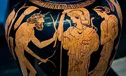 Nausicaa premiered a year after its composition was completed, on 19 August 1961, at the Odeon of Herodes Atticus.[18] More than 150 contributors worked for the opera's first performance;[19] Carlos Surinach was the maestro, John Butler the theatrical director and choreographer and Andreas Nomikos took on the opera's scenography and costume design.[20] The sets were dominated by a stone structure and the costumes were of Greek character, richly decorated with gems;[19] Butler's choreographies were based on Greek traditional dances.[21]