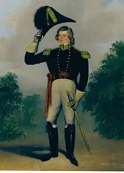 On April 6, 1841 the Nauvoo Legion paraded in a full military display as part of the temple's cornerstone ceremony.[8] Nauvoo's fourteen companies and two volunteer Mormon cohorts marched from assigned points to the temple grounds, led by Brigadier Generals William Law and Don Carlos Smith.[8] Their entrances were marked by artillery fire.[8] At 9:30 am, Lieutenant General Joseph Smith reviewed the Legion, surrounded by guard, staff, and field officers. His entrance was marked by distant cannon fire.[8] He appeared on horseback in full military suit – a black cap with a red plume, a black coat, a red sash, and white pants, edged down the sides with red stripes.[8] Emma Smith rode sidesaddle next to him, followed by a number of women on horseback; during the ceremonies Emma presented Joseph with a silk American flag.[8] They were joined on stage by Major General John C. Bennett.[8]