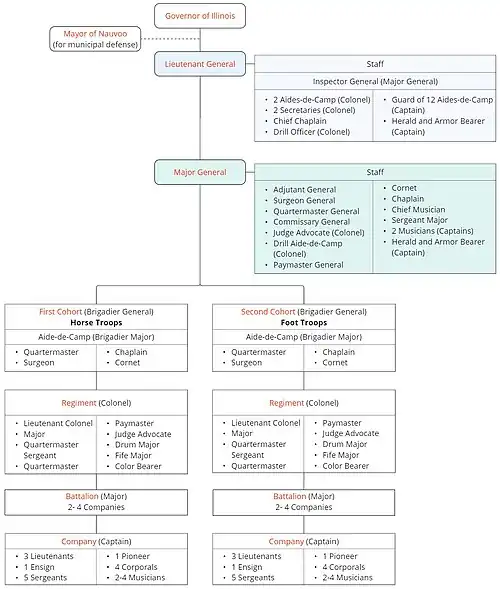 The Legion was unique among American militia organizations for its disproportionate number of high-ranking officers to regular soldiers.[2] At one point there were 13 major-generals and an even higher number of brigadier-generals.[2] Other ranks commissioned for the Nauvoo Legion included Judge Advocate, Assistant Chaplain, and Herald and Armour-Bearer.[2] Although the United States army and other contemporary militias held no office higher than a major-general, Joseph Smith held the rank of lieutenant-general, an honor that had not been bestowed on any American since George Washington.[5] Historian Harold Schindler argues that the rank of Lieutenant General was granted to Smith by the State of Illinois in exchange for the Latter Day Saint vote in upcoming elections.[7] Brigham Young remarked, "If the war [with Mexico] broke out, he would have become commander-in-chief of the United States armies."[7]