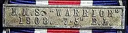 Since the medal could be won multiple times, each subsequent award is indicated by the award of a clasp which is inscribed with the ship's name, year, gun bore and gun type. The clasp was designed to be attached to the suspender with rivets, in roller chain fashion. The clasp depicted alongside was awarded to 208318 Able Seaman H. Croton of HMS Warrior who had won his medal in 1907, as the 1908 champion on the 7½ inch 50-calibre breech loading naval gun.[5]
