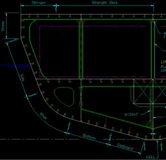 The complete structure of the ship is designed with panels shaped in a rectangular form consisting of steel plating supported on four edges. Combined in a large surface area the Grillages create the hull of the ship, deck, and bulkheads while still providing mutual support of the frames. Though the structure of the ship is sturdy enough to hold itself together the main force it has to overcome is longitudinal bending creating a strain against its hull, its structure must be designed so that the material is disposed as much forward and aft as possible.[7]