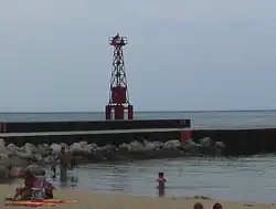 In 1868 the US government began widening and improving Mears's channel.[5] The channel was widened to 150 feet (46 m) and dredged to a depth of 16 feet (4.9 m).[4] Two piers were constructed, and in 1873 a timber-framed lighthouse, 33 feet (10 m) high,[4] was built on the south pier.[6] A red 6th-order Fresnel lens was installed.[4] A life-saving station was constructed on the north pier in 1887,[5] and in 1917 the pierhead light was automated.[4]