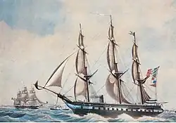 Naval expenditure fell significantly after Charles' death in 1831, as his successor, Charles Albert, was not interested in naval matters.[10] In the 1830s, the fleet sent its warships abroad, frequently to South American waters, to protect Sardinian economic interests in the region. In 1833, Sardinia signed an alliance with the Neapolitans, and that year, the two countries sent a combined squadron of three Sardinian and one Neapolitan frigates to attack Tunis. The squadron forced the city to pay compensation for attacks on Italian merchant vessels. Naval construction continued apace and in 1834, the fleet acquired its first steam warship, the sloop Gulnara, powered by a British-built steam engine. The 24-gun corvette Aquila was launched in 1838, followed by the paddle corvette Tripoli in 1840 and the next year saw the launch of the 18-gun brig Eridano and the powerful 64-gun frigate San Michele; the latter vessel carried the first shell-firing Paixhans guns of the Sardinian fleet. By 1847, the fleet included five paddle steamers.[1][11]