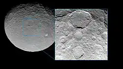 - ^ a b Frigeri, Alessandro; et al. (December 2018). "The geology of the Nawish quadrangle of Ceres: The rim of an ancient basin" (PDF). Icarus. 316. Elsevier: 114–127. doi:10.1016/j.icarus.2018.08.015. S2CID 135182579.