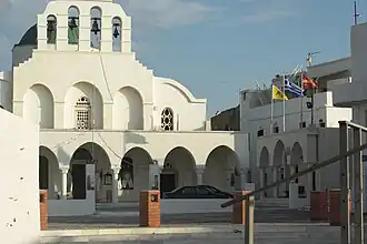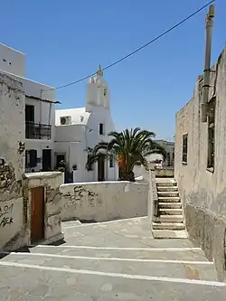 Bourgos (Greek: Μπούργος) is the name of the district north of the castle. Traditionally, it was inhabited by the city's merchants and artisans, and, in general, by a 'middle class' of people whose main occupation was not agriculture.[11] The name comes from the Venetian word borgo, which refers to a kind of fortified settlement. This part of the city was lightly fortified and only accessible by three gates. The houses are built very close to each other, with the streets being very narrow and winding, with a lot of dead ends. This layout is often likened to a labyrinth, and it is believed that it was built this way in part to disorientate any intruders, most notably pirates.[11] All roads going in or out of Bourgos eventually lead to the castle or towards the sea.[11] The area has a high density of churches,[13] some small squares, arched passageways, and white houses, following the typical Cycladic architecture.[13] Right next to Bourgos, outside one of the gates, there is the neighborhood of Evriaki (Greek: Εβριακή, meaning 'Jewish'), which used to be the city's Jewish quarter.