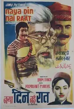 Naya Din Nai Raat (transl. New Day, New Night) is a 1974 Indian Hindi-language drama film directed by A. Bhimsingh. The film is a remake of 1964 Tamil movie Navarathri.[1] The film stars Sanjeev Kumar in nine roles. It enhanced his status and reputation as an actor in Hindi cinema. The nine roles played by Kumar correspond to the navarasa (nine rasas).[2]