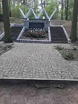 In August 1944, with the Red Army approcahing, a special German unit quartered near the place of execution burned the bodies of the victims for two days and two nights.[20] After the war, the execution site revealed ashes of the murdered, bone fragments, buttons, belt buckles, etc. A monument has been erected at the execution place to honor the victims.[21]