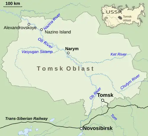 The Nazino tragedy (Russian: Назинская трагедия, romanized: Nazinskaya tragediya) was the mass deportation of around 6,700 prisoners to Nazino Island,[1] located on the Ob River in West Siberian Krai, Russian Soviet Federative Socialist Republic, Soviet Union (now Tomsk Oblast, Russia), in May 1933. Sent to construct a "special settlement" and to cultivate the island, the deportees were abandoned with only scant supplies of flour for food, little to no tools, and virtually none of the clothing or shelter necessary to survive the harsh Siberian climate. Conditions on Nazino Island deteriorated quickly and resulted in widespread disease, violence, and cannibalism. Within 13 weeks, over 4,000 of the deportees had died or disappeared, and the majority of the survivors were in ill health.[2][3] Those who attempted to leave were killed by armed guards.[2][4]