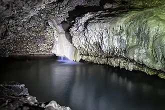 Nazodelavo karst cave formed in a conglomerates of the Neogene geologic period in Odishi plain karst massif.[4] Cave is 600 m long with main tunnel average width of 4 m and height 3 m. The two main outlets are narrower and shorter than the main cave tunnel. A cold underground river with clear water flows through an erosion canyon in cave floor. In some places depth of the erosion canyon reaches 7-8 meters.[5][6]