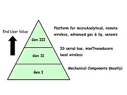 The NeSSI Technology Development Roadmap groups the technology into three generations, which are backward compatible. Generation I is a commercial product and proven in numerous industrial and laboratory applications. Generation II products have been proven in the laboratory but have yet to be commercialized. Generation III (microanalytical) is in development.