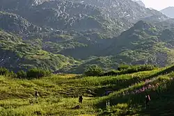 The Neacola Mountains are the northernmost subrange of the Aleutian Range in the U.S. state of Alaska. The range is named for the Neacola River which bounds it to the north and drains the highest and most rugged peaks of the group.[3] They are bordered on the southeast by the Chigmit Mountains, another subrange of the Aleutian Range, on the northeast by the Tordrillo Mountains, and on the west and southwest by the lakes and lowlands of Lake Clark National Park and Preserve. The highest peak is Mount Neacola (also known as "Neacola Peak"), 9,426 feet (2,873 m) although the name is not officially recognized.[1][4]