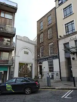 The Charitable and Musical Society met every Friday evening, and when a concert was over would typically finish the night with 'catch singing, mutual friendship, and harmony'.[15] It cost five shillings, 'an English crown', to become a member of the society, and had both Catholic and Protestant members, and titled gentlemen as well as artisans.[16] John Neale died in 1737 and was succeeded by his son William,[2] who would be pivotal in the planning and construction of the Musick Hall, built specifically to accommodate concerts for the benefit of the charity.[17] Prior to the society's decision to raise funds for the construction of this dedicated Musick Hall, there had been a venue in the Bull's Head Tavern known as 'the Great Room in Fishamble Street' which offered space for concerts and balls.[6] There had also been another venue known as the Philharmonick Room located on the same street, situated opposite St. John's Church, which had been built for a group known as the Musical Academy for the Practice of Italian Musick (renamed the Philharmonick Society in 1741) as a replacement for their hall on Crow Street.[6][15][18] The Bull's Head Tavern itself was the largest cage-work house still standing on the western side of Fishamble Street at the time, and belonged to the Dean and Chapter of nearby Christ Church Cathedral.[15] The society engaged Richard Cassels to build the Musick Hall on a site facing the Bull's Head Tavern. Cassels' commission came more or less at the same time as his contract to design Tyrone House on Marlborough Street in Dublin for Marcus Beresford, 1st Earl of Tyrone.[17]
