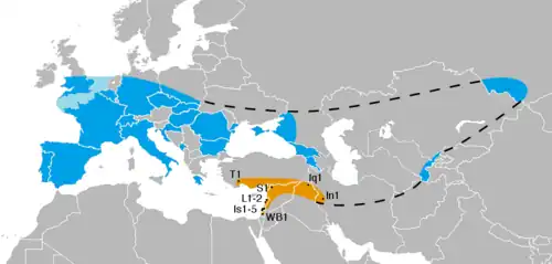 The known range of Neanderthals in Southwest Asia (orange) and elsewhere. Sites that have yielded skeletal remains, tagged by country - Turkey (T1): Karain. Lebanon (L1-2): Ksâr 'Akil and El Masloukh. Israel (Is1-5): Kebara, Tabun, Ein Qashish, Shovakh, and Amud. Palestine (WB1): Shuqba. Syria (S1): Dederiyeh. Iraq (Iq1): Shanidar. Iran (In1): Bisitun. Iran (In1):Wezmeh.