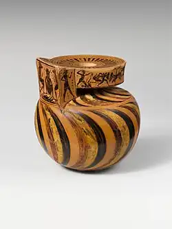 A further vessel that exemplifies his artistic mastery is an aryballos in the Corinthian style, decorated with a frieze of pygmies and cranes along the rim. Strikingly, the vessel is less than 8 cm tall and the frieze only covers a fraction of its surface. Nerachos also produced Little-master cups.
