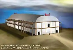 A two-storey structure 60 by 20 meters of mud and wood with a galleried courtyard has been excavated. Its structure and contents indicate it was a major temple. Artefacts include female or Venus figurines, pottery stylised faces, charred bones of animals, and small gold pieces that were perhaps hair or clothing ornaments. It has eight clay platforms, perhaps altars, and the floors and walls of all five rooms on the upper floor were "decorated by red paint, which created [a] ceremonial atmosphere."[5][6]