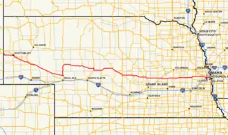 It runs concurrently with US 281 through St. Paul, crosses the Loup River, and then separates from US 281 and goes straight east, intersects US 30, crosses the Platte River for the first of two times near Clarks and meets US 81 west of Osceola. It is then concurrent with US 81 through Osceola and Shelby, before separating east of Shelby. It then passes through Rising City and then goes straight east until it meets US 77 southwest of Wahoo, Nebraska. It passes through Wahoo concurrent with US 77 and goes east with US 77 until they separate near Mead. After passing the south edge of Yutan, it recrosses the Platte River.[1][2]