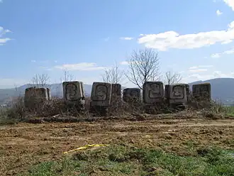 The monument consists of twelve megalithic compositions chiseled from Bihacite stone[3] within a complex of paths and steps. The megaliths have been described variously as "stone dragon sentinels",[4] "paired snakes",[5] "heads of soldiers",[6] and “large stones engraved with strange primitive symbols that recall those of the Bogomils”.[7] They are placed on stone plinths, and set in two irregular arcs, in pairs, with the distance between each pair measuring approximately 2–3 metres.