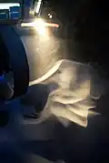 Some examples of Kahn's work to capture the invisible include building facades that move in waves in response to wind;[11][12] indoor tornadoes and vortices made of fog, steam, or fire;[13] and a transparent sphere containing water and sand which, when spun, erodes a beach-like ripple pattern into the sand surface. In 2003 Kahn collaborated with Koning Eizenberg Architecture, Inc. on Articulated Cloud, a piece installed on the exterior walls of the Children's Museum of Pittsburgh consisting of hundreds of movable flaps that respond to the wind creating visible patterns.[11]