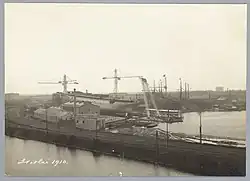 The Wilhelmina dock would be constructed at a special site that the NSM had leased. This site was connected to the former shipyard Gebroeders van Lindern,[12] which also exploited the Koningsdok that lay just west of it. The temporary site of the NSM was designated as 'next to the Koningsdok'.[13] This site would later become the location of the ADM, and currently houses the EYE Film Institute Netherlands. On 25 September 1898 the first pontoon was launched. It measured 96.0 by 70.1 feet (29.25 by 21.36 m), had a hold of 10.9 feet (3.32 m), weighed 440,000 Kg and could lift 1,250,000 Kg. Therefore the six pontoons could lift 7,500,000 Kg in total.[14] The dock had four[15] 18 inch centrifugal pumps each with their own compound steam engine and each with a capacity of 2,000 tons an hour.[16] On 11 October 1898 the second pontoon was launched. On 22 October the third pontoon and on 4 December the fourth. On 24 December the fifth pontoon was launched. On 28 January 1899 the sixth pontoon was launched. On 13 May 1899 the Wilhelmina Dock was taken into use.[16]