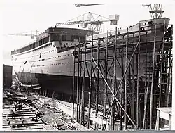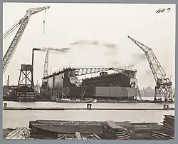 In 1938, the NSM finally had a normal year from a financial perspective. The result allowed a depreciation of 251,463 guilders, and a (real) profit of 133,988 guilders, which allowed a dividend of 5%.[67] 1938 was also memorable for the launch of Oranje of 605.7 feet (184.6 m) and 20,017 GRT. In 1939, the operational result of the NSM almost doubled, and the company decided to build a fifth slipway. In the shareholders meeting of 25 April 1940, the board stated that this fifth slipway had a direct relation with the expected construction of battle cruisers, cf. the Design 1047 battlecruiser.[68] Of the result of 683,555 guilders, most went to depreciation, in part to pay for a switch to electric welding. From the net profit of 133,990, a dividend of 5% was paid.[69]