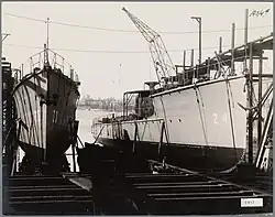 After the war, the total damage to the shipyard was estimated at 3,800,000 guilders.[70] During the war, the fifth slipway had been completed. The quay that was used for finishing ships was expected to be operational by October 1945. A new crane that had been hidden during the war, and some repaired cranes would enable the shipyard to build some 4,000-ton ships within a few months. It was expected that by fall 1946, all slipways would be operational again.[71] By January 1946, three overhead cranes were operational again. In January, the NSM also received an order for two tankers from Norway, which would be completely welded. In February, an order for two freighters for the Vereenigde Nederlandsche Scheepvaartmaatschappij followed.