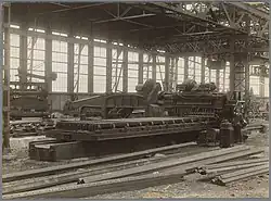 On 6 October 1922 the new shipyard on the north side of the IJ was opened. Many of the workshops were in a main building of 459 by 410 feet (140 by 125 m) with overhead cranes and many modern machines. There was a drill machine that made up to 32 holes at a time, with the sheet metal moving automatically to the next position for the holes to be drilled. There were also very heavy metal cutting machines. In an engine house there were machines to transform the electricity from the municipal grid to the kind required to drive power tools, all machines being driven electrically. There were three concrete slipways, each 620 feet (190 m) long and 74 feet (22.5 m) wide, situated in parallel. The lower end of these slipways was below the waterline and closed of by doors, so ships could easily be launched by letting water onto the slipway.[41]