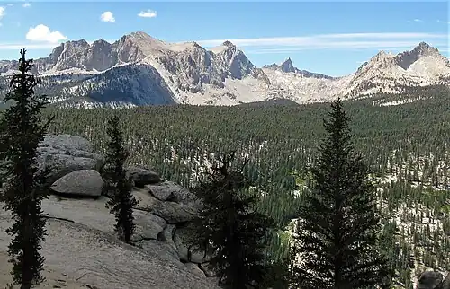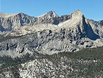 Needham Mountain is a mountain summit of the Sierra Nevada, located in Tulare County, California. It is located in the southern Sierra Nevada, in the central part of Sequoia National Park. Needham Mountain is 6 mi (9.7 km) miles east of Mineral King, 5.6 mi (9.0 km) northeast of Mount Kaweah, and 17 mi (27 km) southwest of the highest peak in the state, Mount Whitney. With an altitude of 12,536 ft (3,821 m), Needham Mountain is the twentieth-highest mountain in California with a prominence of 1,880 ft (570 m).[3][1] The mountain is named after an American congressman who represented California at the turn of the 19th and 20th centuries, James C. Needham.[3] The first ascent of the summit was made in July 1916, by M. R. Parsons, Agnes Vaile, H. B. Graham, and Edmund Chamberlain.[4]