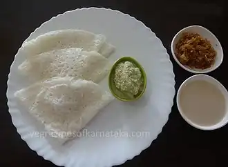 Unlike other dosas neer dosa is known for its simple preparation method and lack of fermentation.[5] Usually, neer dosa is served with coconut chutney, sambar, saagu and non vegetarian curries like chicken, mutton, fish and egg curry.[6]