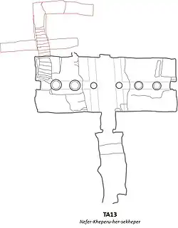 The tomb is unfinished and in a good state. Its layout is similar to that of other Amarna tombs. It consists of one room, with six white columns in one row perpendicular to the entry; the distance between the two middle ones is slightly more than between the others. Work has been started on the back wall of the room, there would have been another room or possibly a shrine there. Decoration below the ceiling is complete, only the colours and the inscriptions are missing. Decoration lower on the wall is completely missing; on the south side even the columns haven't been carved completely.[4] By the time the burial took place it must have been evident that the tomb wouldn't be finished; after finishing the room and most of the columns the workers began to work in the northeastern corner, the usual place of the stairs leading to the burial chamber. The chamber itself was just large enough to contain the sarcophagus. Two corridors leading from it are either contemporary or were carved later.[4]